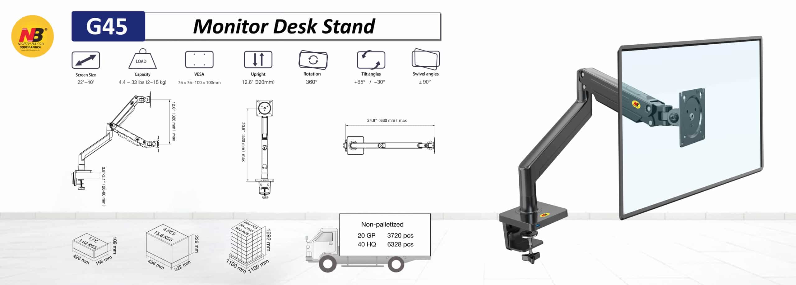 North Bayou Full Motion Swivel Monitor Mount with Gas Spring for 22”-40” Monitors- Black(G45)